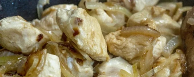 Пилешкото месо се задушава в много лук, който ще придаде на ястието сочност и аромат.