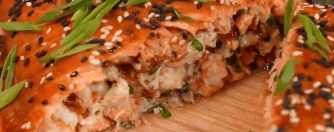Тази рецепта е ястие, което завладява с баланса между нежност и наситен вкус. Сочна сьомга, ароматна плънка от скариди и спанак, гъсти сулугуни и лъскава глазура от сос терияки – това ястие буквално се топи в устата. И нещо повече, то е готово за по-малко от половин час.